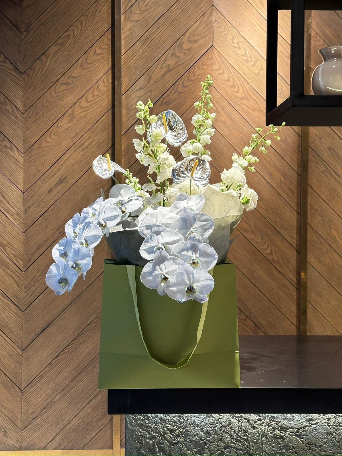 Artistic Foiled Silver or Gold Fresh Flowers Comes with Dancing Exotic Orchids.